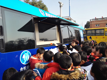 到達(dá)學(xué)校正是課間活動時間,“徑山號”一出現(xiàn)就吸引了大家的眼球,學(xué)生們好奇的圍繞在車旁,議論紛紛。在學(xué)校老師的協(xié)助下,學(xué)生們在車前整齊的列成了兩隊,余杭公交的工作人員也做好了上課的準(zhǔn)備。