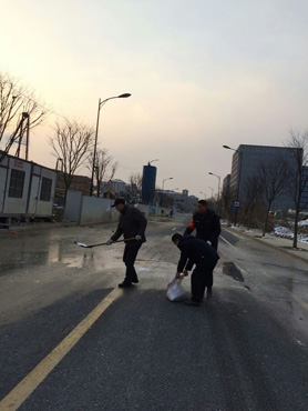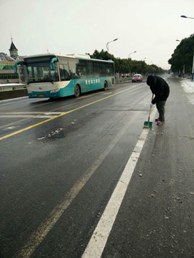 早晨7時,六車隊組織班組長在西溪北苑北抗冰凍。