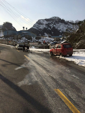 巡查人員在中泰董家山、桃?guī)X山等路段發(fā)現(xiàn)冰凍路段,及時撒鹽融雪作業(yè)。