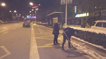 清晨5點,三車隊工作人員在地址大隊站附近鏟雪,防止側(cè)滑。